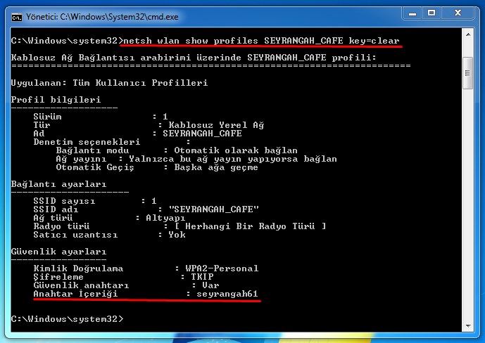 3- Hangi bağlantıya/kablosuz ağa ait şifreyi öğrenmek istiyorsanız WİFİ-ADI yazılan yere onu yazıp siyah ekrana netsh wlan show profiles WİFİ-ADI key=clear yazıp entera basın. Şifresi ekrana gelecektir.