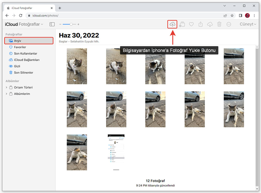 — Bilgisayardan Telefona Fotoğraf Yükleme İçin: iCloud Fotoğrafları sekmesini seçtikten sonra üstteki “Fotoğrafları veya Videoları Karşıya Yükle” kısmını tıklayın ve istediğiniz görselleri telefonunuza yükleyin.
