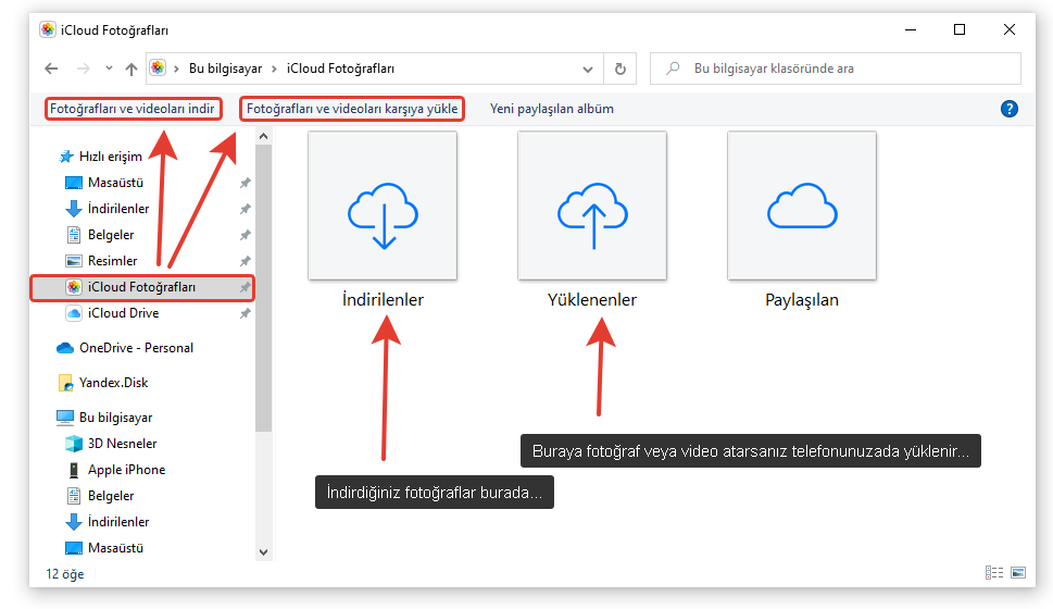 Şimdi rastgele bir klasör açalım ve sol menüden iCloud Fotoğrafları sekmesini seçelim.