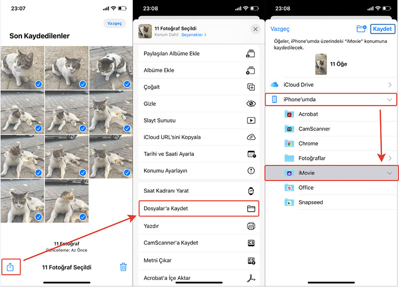 Şimdi ilk olarak telefonumuzdaki fotoğrafların bir kopyasını iMovie klasörüne taşıyacağız. Bunun için telefondan -bilgisayarımıza indirmek istediğimiz- fotoğraflarımızı seçtikten sonra paylaş butonunu tıklayarak “Dosyalara Kaydet – iPhone’umda – iMove” klasörünü seçip “Kaydet” diyoruz. Böylece telefonumuzdan seçtiğimiz fotoğrafların bir kopyası iMovie klasörüne taşınmış olacak.