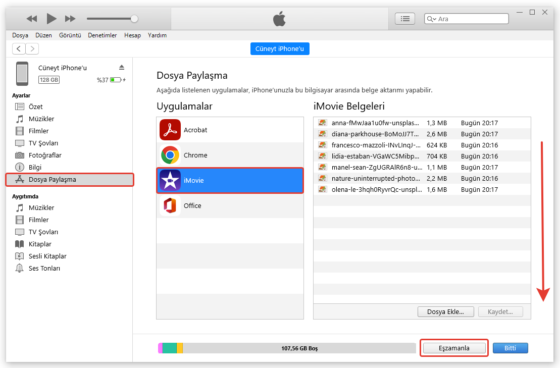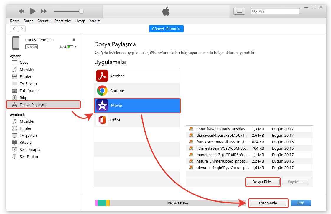 Karşımıza yeni bir sayfa gelecektir. Bu sayfada “Dosya Paylaşma” sekmesine gidelim ve iMovie uygulamasını seçelim. (Başka uygulama varsa onları da seçebilirsiniz ancak olayı kavramanız açısından iMovie uygulamasından örnek gösteriyorum ve ayrıca iMovie uygulamasını App Store’den telefonunuza indirip kurmayı unutmayın.)