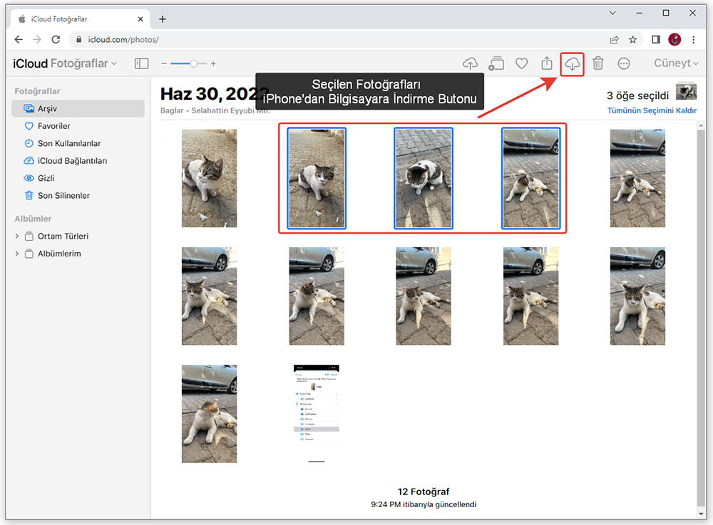 — Telefondan Bilgisayara Fotoğraf Atmak İçin: iCloud Fotoğrafları sekmesini seçtikten sonra üstteki “Fotoğrafları veya Videoları İndir” kısmını tıklayın ve istediğiniz görselleri indirin.