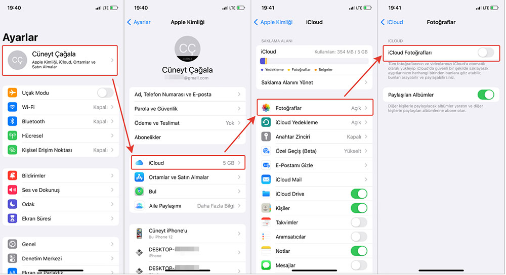 Giriş yaptıktan sonra telefonunuzdan “Ayarlar – Apple Kimliği – iCloud – Fotoğraflar” sekmesine kadar gidin ve “iCloud Fotoğraflar” senkronizasyonunu kapatın. (Bu yöntemi kullanabilmek için bu şekilde yapmanız zorunludur.)