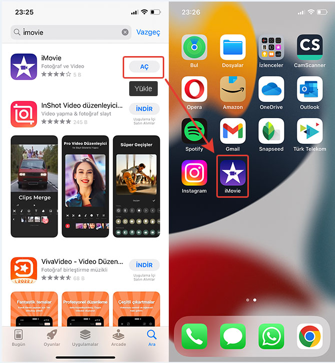 iMovie uygulamasını AppStore’dan telefonumuza indirip kuralım.