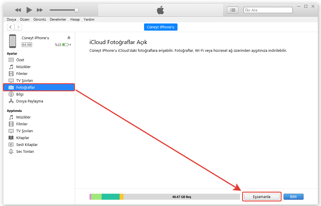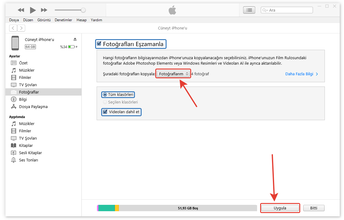 4- iTunes ile Bilgisayardan iPhone’a Fotoğraf Atma