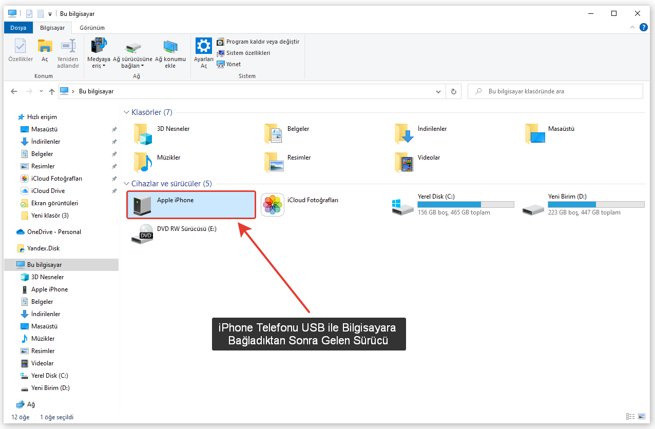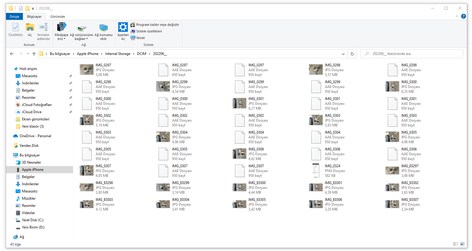 Böylece artık bilgisayarınızdan iPhone içindeki fotoğraf ve videolara erişebilirsiniz. Bilgisayarınıza geçiş yaptıktan sonra rastgele bir klasör açıp sol taraftaki menülerden veya “Bu bilgisayar” klasöründen “Apple iPhone” sürücüsüne girerek DCIM klasörü altında bulunan klasörden çektiğiniz fotoğraf ve videoları toplu halde veya tek tek kopyalayarak bilgisayarınıza indirebilirsiniz. İşlem bu kadar basit.