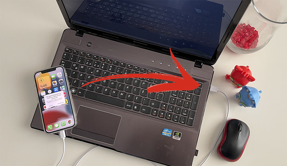 USB kablosunu kullanarak iPhone telefonu ve bilgisayarı birbirine bağlayalım.