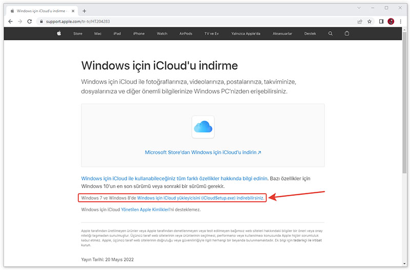 Gelen pencerede “Windows 7 ve Windows 8’de Windows için iCloud yükleyicisini (iCloudSetup.exe) indirebilirsiniz.” kısmını tıklayarak uygulamayı indirmenizi tavsiye ediyorum. İşletim sisteminiz Windows 10 olması önemli değil. Neredeyse tüm işletim sistemlerine uyumludur.