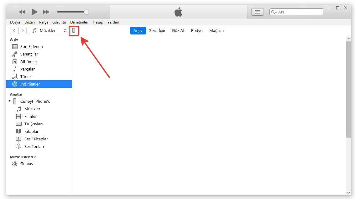 Şimdi iTunes uygulamasına açalım ve alttaki görselde gösterdiğim “telefon simgesine” tıklayalım. (USB Kablosunu bağlamazsanız bu simge çıkmayacaktır.)