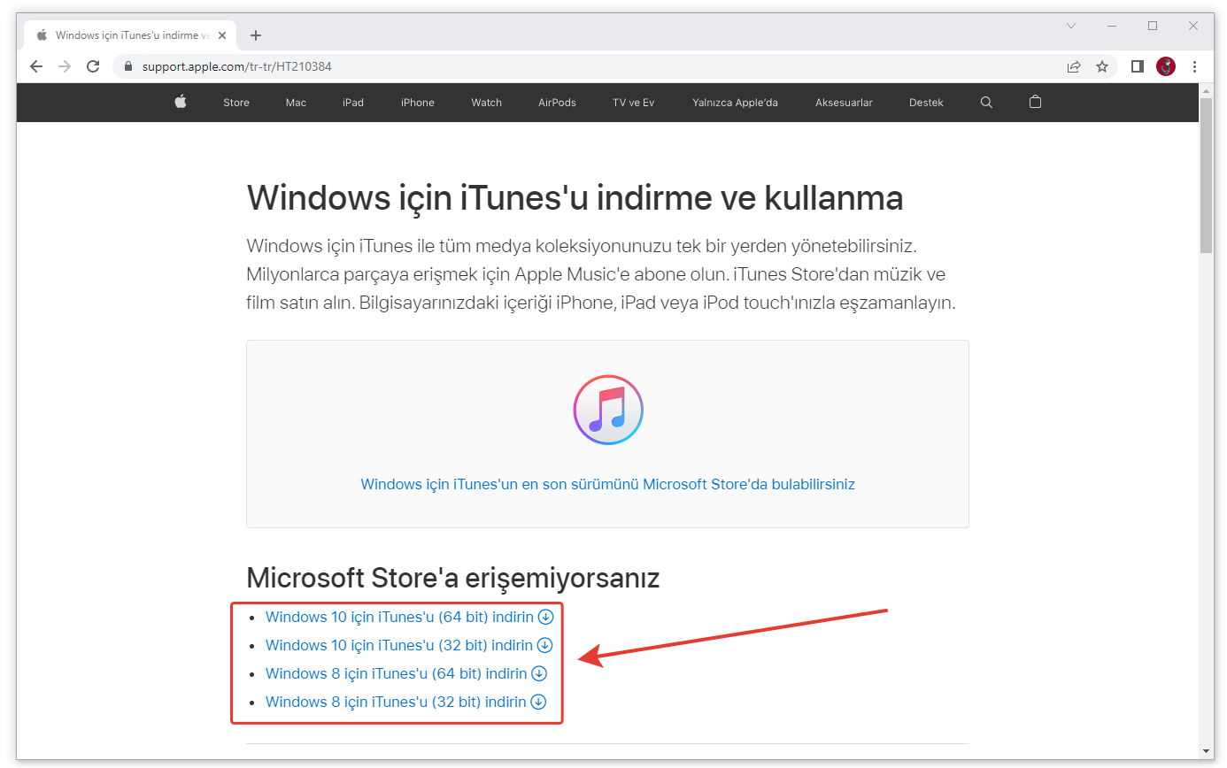Karşınıza gelen pencerede Windows 8 ve Windows 10 iTunes yükleyicisini (iTunesSetup.exe) indirebilirsiniz.