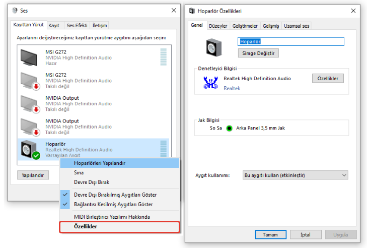 Yine benzer bir şekilde ses aygıtının üzerini sağ tıklayarak “Özellikler” diyoruz. Karşımıza gelen pencerede “doğru ses kanalını” seçip sına diyoruz. Genel, düzeyler, geliştirmeler, gelişmiş ve uzamsal ses sekmelerinde ki ayarları kontrol edip; gerekirse sekmelerde bulunan “varsayılan ayarlar” kısmına tıklayarak eski haline getiriyoruz.