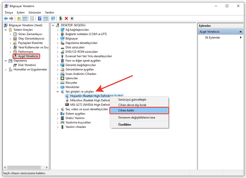 2- İkinci yöntemimizde Windows ve R tuşlarına basıp gelen “Çalıştır” penceresine “compmgmt.msc” yazıp “Enter” yapıyoruz. Karşımıza “Bilgisayar Yönetimi” penceresi gelecektir. Burada “Ses Giriş Çıkışları” yazan yerin altında bulunan tüm ses aygıtlarının üzerini sağ tıklayıp “Cihazı Kaldır” diyoruz. Ardından bilgisayarımızı yeniden başlatıyoruz. Bu işlemimiz var olan ses aygıtlarınızın yeniden yüklenerek çalışmasına neden olacaktır.