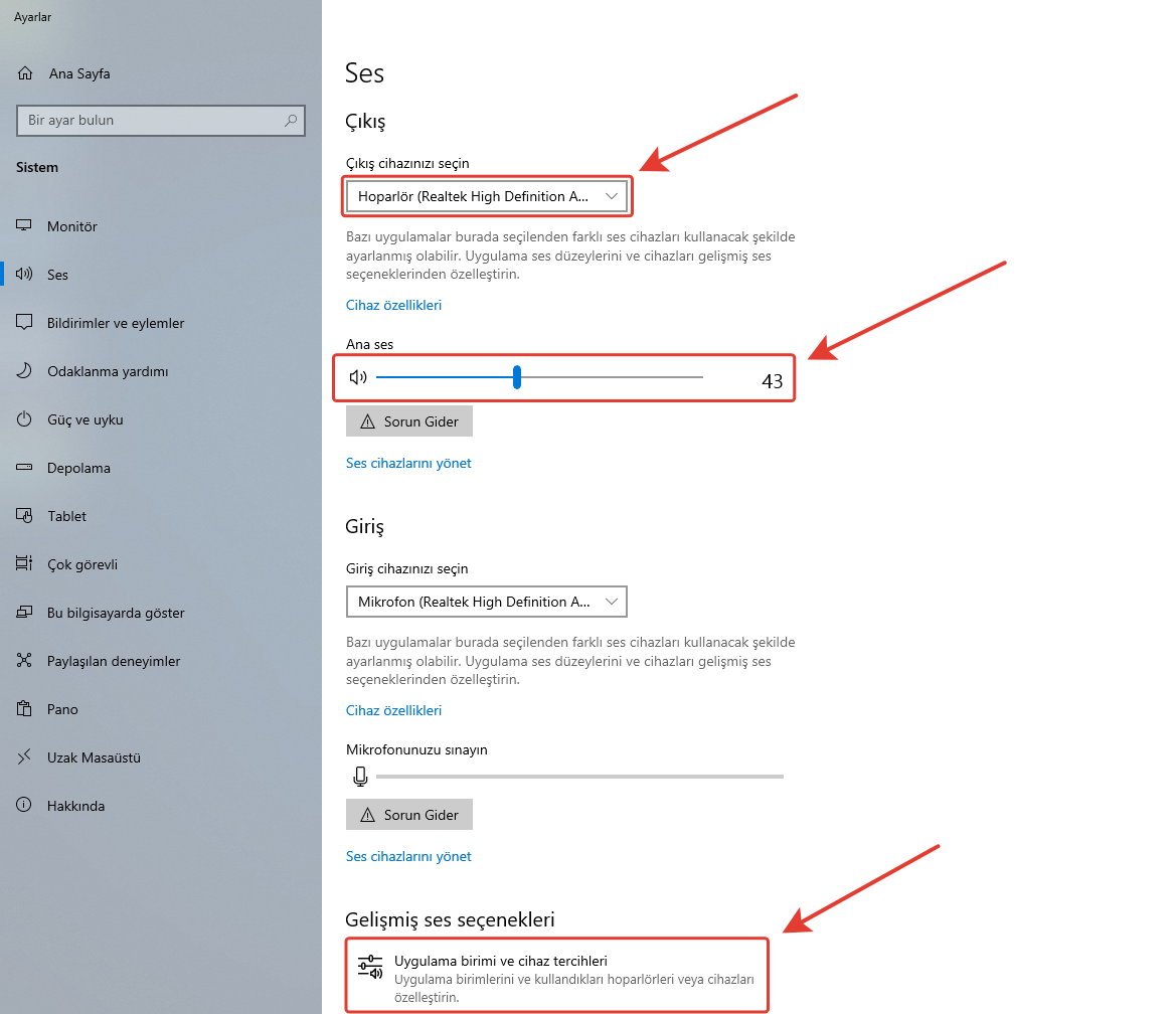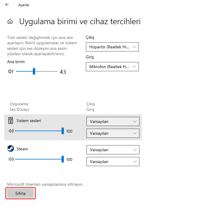 7- Yine benzer bir şekilde üstteki ses ayarlarına ulaşmak için ses simgesinin üzerini sağ tıklayıp “ses ayarlarını aç” dediğimizde karşımıza gelen sayfadan “çıkış cihazını seçin” seçeneğinden sesin çıkmasını istediğimiz aygıtı belirlememiz gerekiyor. Yine bu sayfanın en alt kısmında ki “Uygulama Birimi ve Cihaz Tercihleri” sekmesinden “Sıfırla” diyerek sesleri varsayılan ayarlara dönüştürmeniz gerecek.