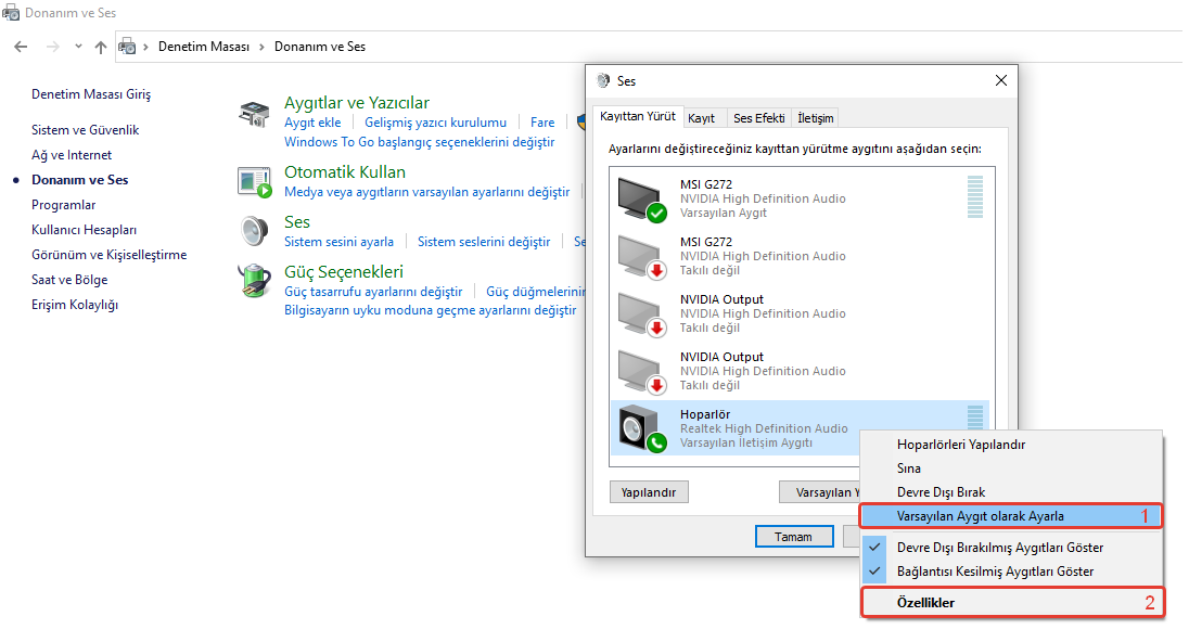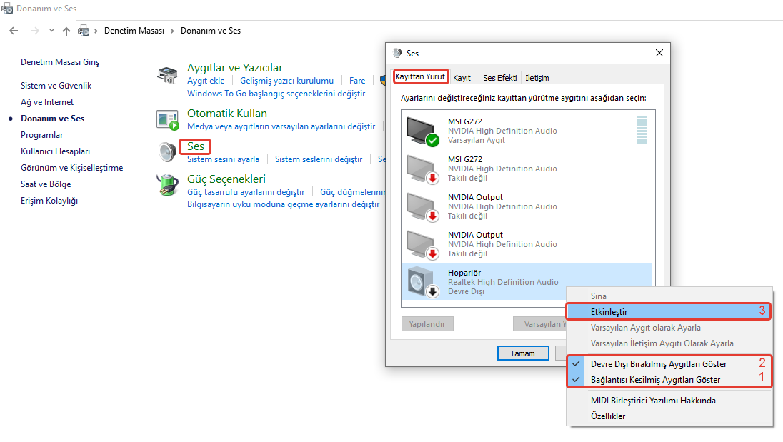 4- Burada ise sırasıyla Denetim Masası – Donanım ve Ses kısmına gelerek “Ses” seçeneğini tıklıyoruz. Karşımıza gelen pencerede ilk olarak sağ tıklayarak sırasıyla “Bağlantısı Kesilmiş Aygıtları Göster” ve “Devre Dışı Bırakılmış Aygıtları Göster” seçeneklerinin solundaki “kutucuğu” seçili hale getiriyoruz. Ardından “Hoparlör” yazan yerin üzerini sağ tıklayıp “Etkinleştiriyoruz” bu işlemden sonra ses aygıtımızı kontrol ediyoruz.