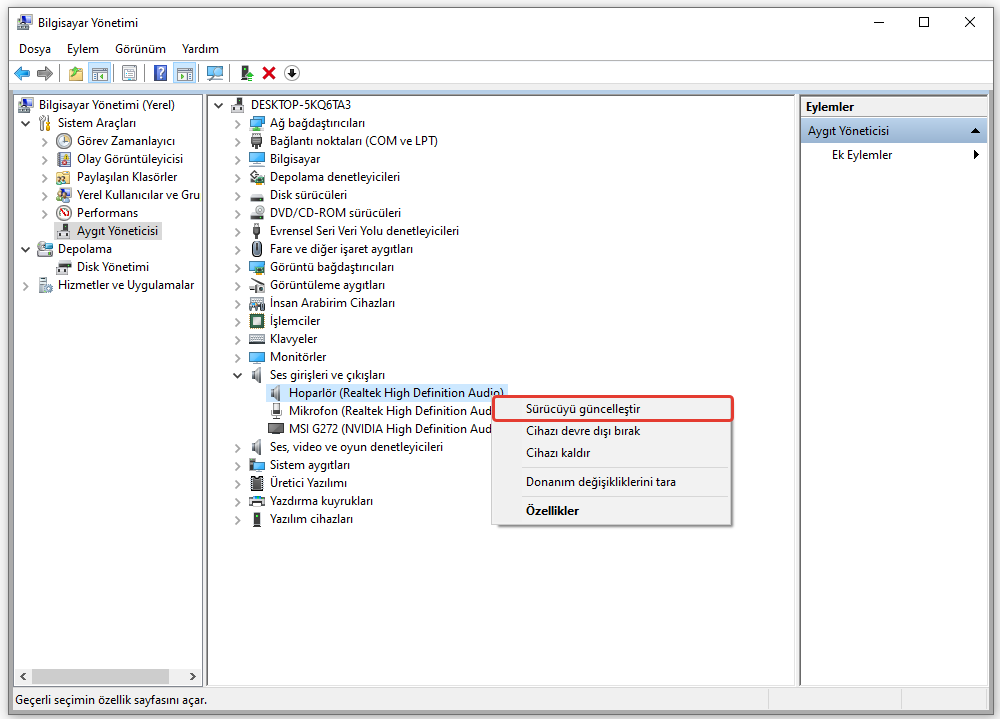 13- Bu yöntemimizde ise Windows ve R tuşlarına basıp gelen “Çalıştır” penceresine “compmgmt.msc” yazıp “Enter” yapıyoruz. Karşımıza “Bilgisayar Yönetimi” penceresi gelecektir. Burada “Aygıt Yöneticisini” açtığımızda “Ses Giriş Çıkışları” yazan yerin altında bulunan ses aygıtımızın üzerini sağ tıklayıp “Sürücüyü Güncelleştir” diyoruz. Ardından ilerleyerek otomatik olarak sürücüyü yüklemesini sağlıyoruz. Bu işlemimiz var olan ses aygıtlarınızın yeniden yüklenerek çalışmasına neden olacaktır.
