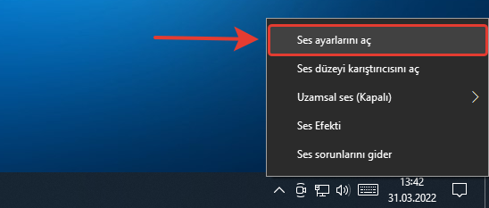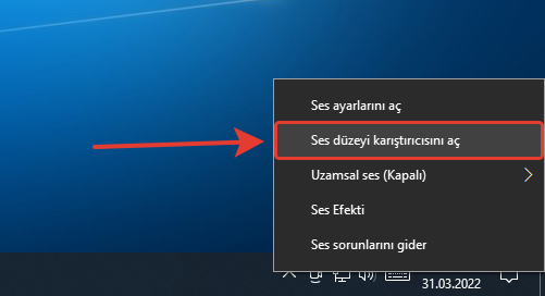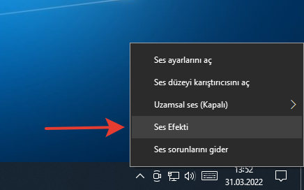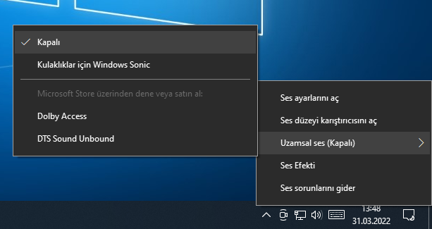 9- Ses simgesinin üzerini sağ tıklayıp “Uzamsal Ses” seçeneğini seçtiğinizde ekstra bir ses deneyimi yaşayacağınız anlamına geliyor. Tabi kullandığınız ses sistemi bunu destekliyorsa. Uzamsal ses aslında bir 3B ses türüdür. Uzamsal ses ile, sadece önden, arkadan ve yanlardan değil aynı zamanda yukarıdan ve/veya aşağıdan geliyormuş gibi görünmesi için bir araya gelir. Temelde 360 derecelik bir ses deneyimi yaşatır diyebiliriz. (Konu ile çok ilgisi yok ama –özellikle merak edenler için– bunu bilmenizde fayda var.)