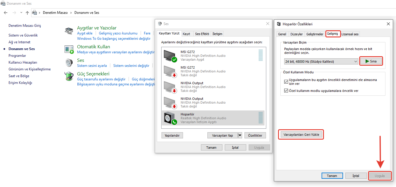 Ardından Hoparlör” yazan yerin üzerini sağ tıklayıp “Özellikler” diyoruz. Gelen pencerede “Gelişmiş” sekmesine giderek “Varsayılan Ayarlara Geri Yükle” diyerek “Sına” butonuna tıklıyoruz. Bu durumda hoparlörlerden ses gelmesi gerekecektir. İşlem doğru ise “Uygula” ve “Tamam” diyerek çıkıyoruz.
