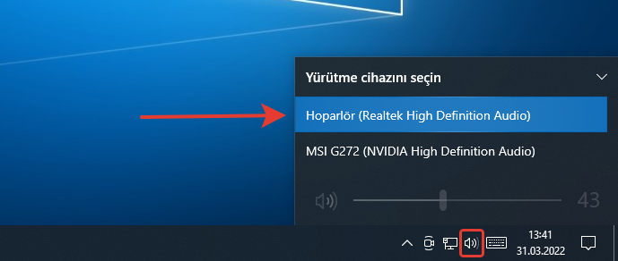 6- Arkadaşlar öncelikle bilgisayarınızdan doğru ses kaynağını seçtiğinize emin olun! Eğer bilgisayarınızda aşağıdaki görseldeki gibi bir ses simgesi varsa üzerini tıklayarak doğru ses kaynağını seçtiğinize emin olun. Mesela benim bilgisayarımda bir kulaklık, ses sistemi ve monitörün dahili bir hoparlörü bulunuyor. Ben eğer ses simgesini tıkladığımda çalışmayan veya devre dışı kalmış bir ses aygıtını seçersem haliyle istediğim kadar ses ayarları ile oynayayım ses çıkmayacaktır. Bu nedenle ses simgesini üzerini tıkladıktan sonra karşımıza gelen seçeneklerden doğru ses aygıtını seçmek durumundayız.