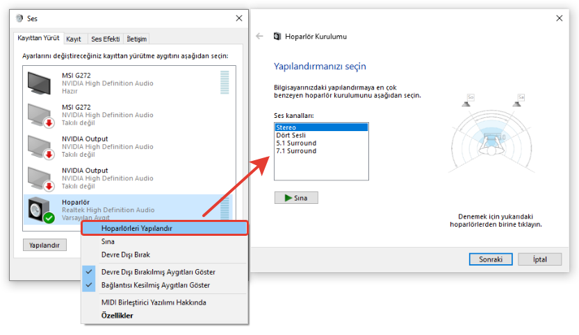 10- Ses simgesinin üzerini sağ tıklayıp “Ses Efektini” seçtiğinizde ise bu sizi “Denetim Masasında” bulunan “Ses” ayarlarına götürecektir. Bu bir çeşit hızlı erişim diyebiliriz. Burada “Kayıttan Yürüt” sekmesinde kullandığınız hoparlörün üzerinin yeşil check işareti ile işaretlenmiş olması gerekiyor. Bu sayfa oldukça önemli aslında ve birçok ayarlamayı buradan yapmanız gerekiyor. Kullandığınız ses aygıtının üzerini sağ tıklayıp etkinleştir diyerek aktifleştirdikten sonra yeşil check işareti ile işaretlenmiş olacaktır. Bu durumda bu aygıt artık varsayılan ses aygıtınız olarak kullanılacaktır. Burada ses aygıtının üzerini sağ tıklayarak “Hoparlörleri Yapılandır” diyoruz. Karşımıza gelen pencerede “doğru ses kanalını” seçip sına diyoruz. Hiç bir şey bilmiyorsanız bile “Stereo” seçeneğini seçip “Sına” diyerek çıkan sesi kontrol edebilirsiniz.