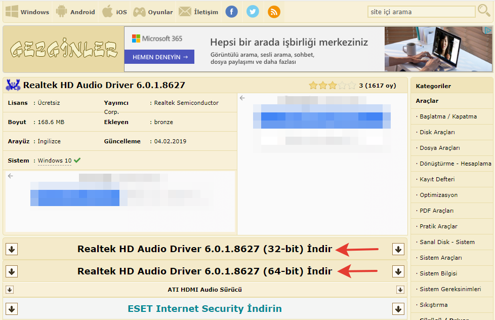 1- İlk yöntemimizde tüm bilgisayarlarda “Realtek HD Audio Driver” yani “Ses Sürücüsünün” yüklü olması gerekiyor. Bazı durumlarda otomatik, bazı durumlarda Windows Update ile yükleniyor. Ancak çoğu bilgisayar kullanıcısı bu sürücüyü yüklemediği için ses sorunu yaşıyor diyebilirim. İlk olarak bu sürücüyü hemen buradan (tıkla) indirip ardından bilgisayarınıza kurun. Bu evrensel bir sürücüdür ve tüm işletim sistemlerine uyum sağlar. Yükleme işlemi bittiğine bilgisayarınızı yeniden başlatacaktır. Yeniden başlatma sonrasında ses normale dönecektir. Not: Bilgisayarınızın kaç BİT (32 veya 64 BİT) olduğunu bilmiyorsanız burayı (tıkla) tıklayarak öğrenebilirsiniz.