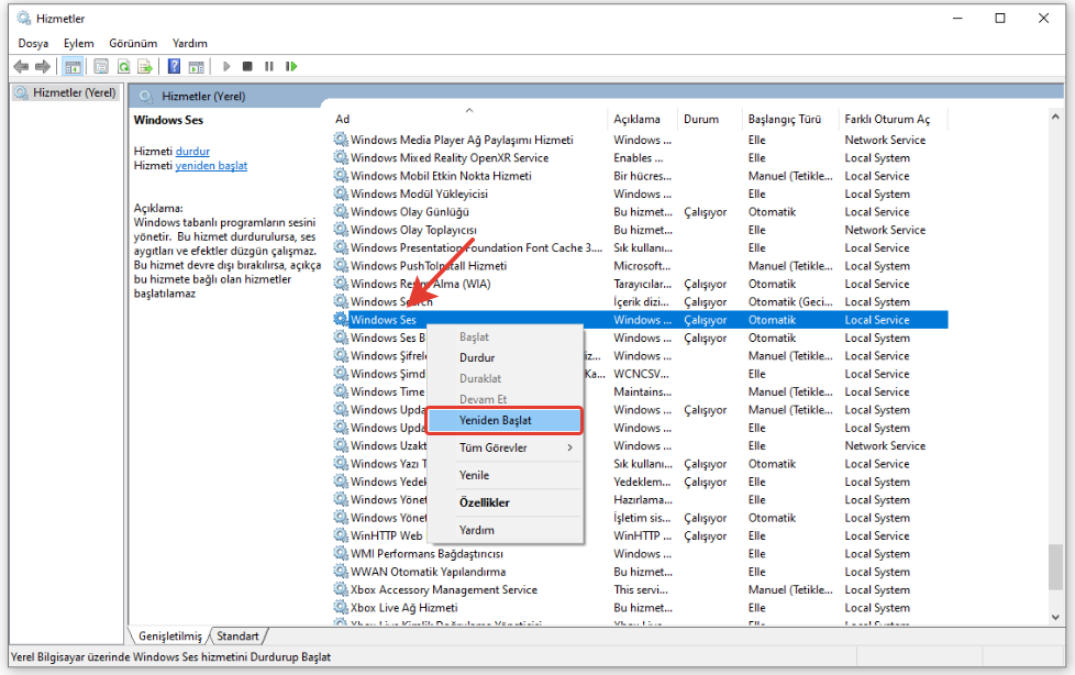 3- Bu yöntemimizde Windows ve R tuşlarına basıp gelen “Çalıştır” penceresine “services.msc” yazıp “Enter” yapıyoruz. Karşımıza “Hizmetler” penceresi gelecektir. Burada “Windows Ses” yazan yerin üzerini sağ tıklayıp “Yeniden Başlat” diyoruz. Bu kapalı durumdaki ses aygıtınızın çalışmasına neden olacaktır. Bazı bilgisayarlar için yeniden başlatma gerekebilir.