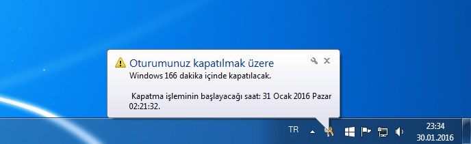 3- Komutu girdiğiniz anda sağ alt kısımda bilgisayarınızın ne zaman kapatılacağına dair uyarı yazısı gelecektir. Herkese bol güneşli günler. Selametle kalın.