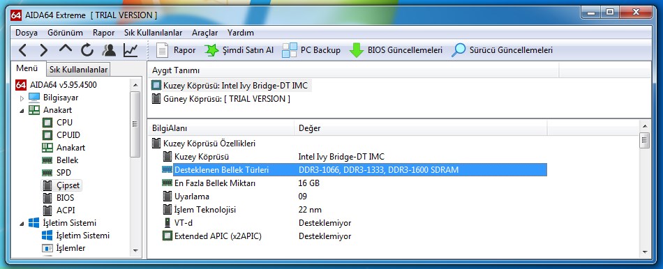 Burada bulunan linkten AIDA64 Extreme Edition (Everest Ultimate) adlı programı indirip kurun. Program oldukça basit olup kısa bir sürede bilgisayarınıza indirip kurabilirsiniz. Programın ana amacı bilgisayarınızın sistemi ile ilgili tüm detaylar hakkında bilgi vermek. Programı çalıştırdıktan sonra Anakart >>> Çipset yazan kısma gelin ve Bilgi Alanı kısmında bilgisayarınızın desteklediği RAM tiplerini, frekansınız (Mhz) öğrenebilirsiniz.