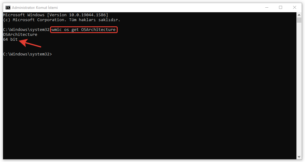 2- Bu yöntemimizde komut istemcisini kullanarak hızlı bir şekilde bilgisayarınızın kaç bit olduğunu öğrenmeniz mümkün. İlk olarak arama sekmesine “cmd” yazıyoruz ve açılan panelde “Komut İsteminin” üzerini sağ tıklayıp “Yönetici Olarak Çalıştır” diyoruz. Karşımıza gelen siyah panele wmic os get OSArchitecture komutunu yazıp enter yapıyoruz. Böylece aynı ekranda bilgisayarınızın kaç bit olduğu çıkacaktır.