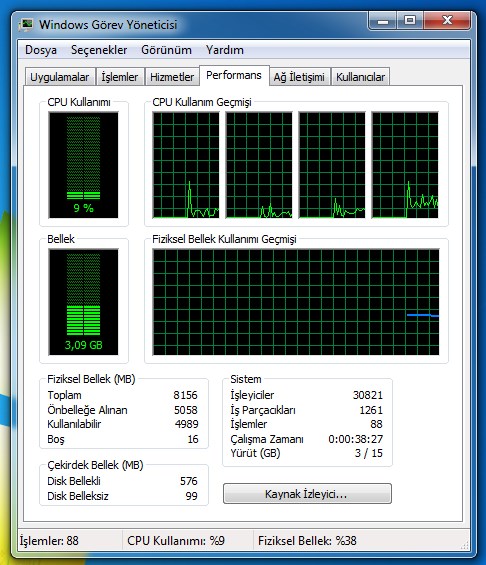 Eğer bilgisayarınızın toplam çalışma süresini görmek istiyorsanız CTRL+ALT+DEL tuşlarına bastıktan sonra açılan kısımdan Görev Yöneticisini seçin ve buradan Performans kısmına gelin. Burada çalışma zamanı yazan kısımdaki süre bilgisayarınızın çalıştığı toplam zamanı göstermektedir.