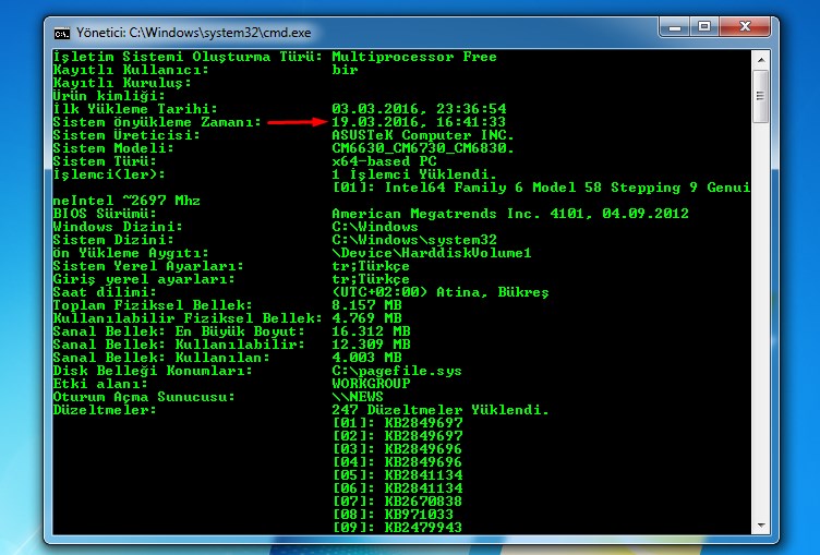 Kullandığınız dizüstü veya masaüstü bilgisayarın hangi tarihten itibaren açık olduğunu öğrenmek için yapacağınız işlem Başlat >>> Çalıştır >>> cmd >>> açılan pencereye systeminfo yazdıktan sonra enter yapın.
