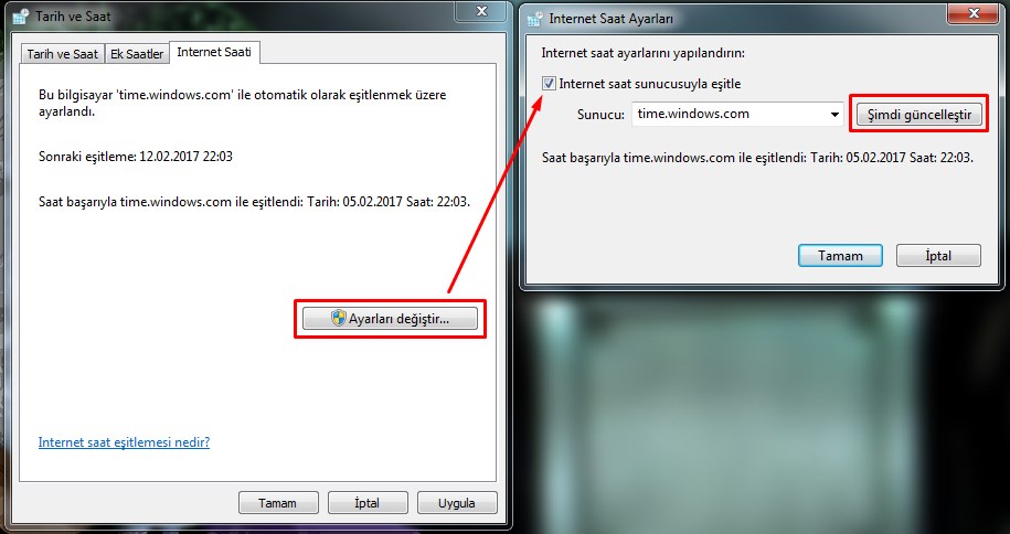 3- Ve son olarak İnternet Saati sekmesini seçerek alttaki AYARLARI DEĞİŞTİR‘i seçin ve açılan küçük panelde Aşağıdaki gibi chechbox’ı klikleyerek Şimdi güncelleştir deyin. Artık saat ve tarihiniz doğru. Bundan sonra değişmeyecek.