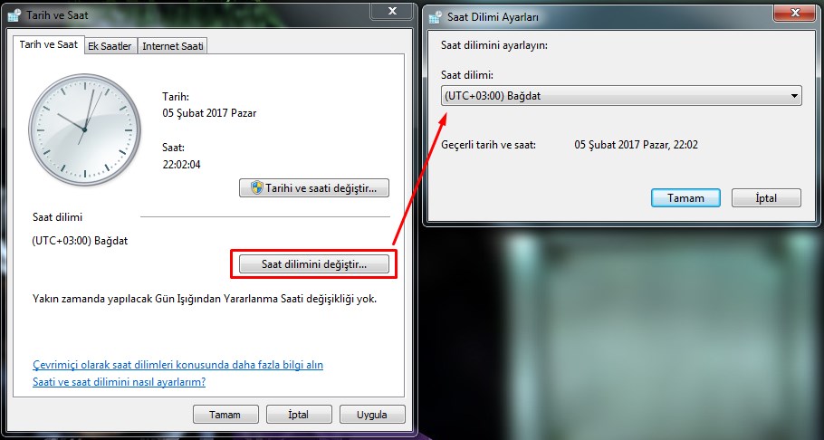 2- Bu adımda açılan pencerede UTC+03:00 Bağdat‘ı seçin. Güncelleme henüz gelmediğinden dolayı İstanbul UTC+03:00 yok. Bunu aşağıdaki gibi yaptıktan sonra TAMAM deyin.