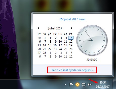 1- Bilgisayarınızın sağ altında bulunan saat-tarih kısmını klikleyin ve açılan pencerede saat tarih ayarlarını değiştir seçeneğini seçin.