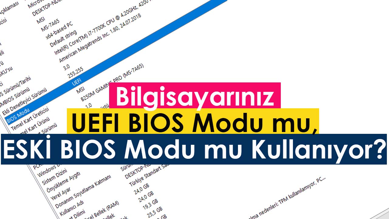 Herkese Merhaba. Bu videomuzda bilgisayarınızın hangi tür BIOS Modu kullandığı konusunda kısaca bilgi vermeye çalışacağım. Ya da başka bir ifade ile bilgisayarınız Eski BIOS Modu yoluyla mı, yoksa UEFI BIOS Modu yoluyla mı önyükleme yapıyor? sorusunun cevabını vereceğiz. Peki bu ne işimize yarayacak özellikle USB bellek ile format USB’si oluştururken veya bilgisayarımıza yüksek kapasiteli yeni bir disk (HDD/SSD) satın alırken bu bilgi işimize yarayacaktır.