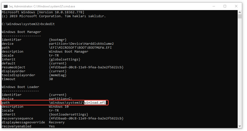 2- Görev çubuğu üzerinde sağ klik, Görev Yöneticisi buradan Dosya | Yeni Görevi Çalıştır kısmına cmd yazıp “Yönetici Bu görevi yönetici ayrıcalıklarıyla oluştur” seçeneğini seçiyoruz ve Tamam diyoruz. Komut istemini “yönetici olarak” açalım. Buraya “bcdedit” yazıp enter yapalım. Gelen pencerede Patch kısmının karşısında winload.efi yazıyorsa bilgisayarınızda UEFI BIOS Modu, winload.exe yazıyorsa ESKİ BIOS Modu kullandığınız anlamına gelecektir.