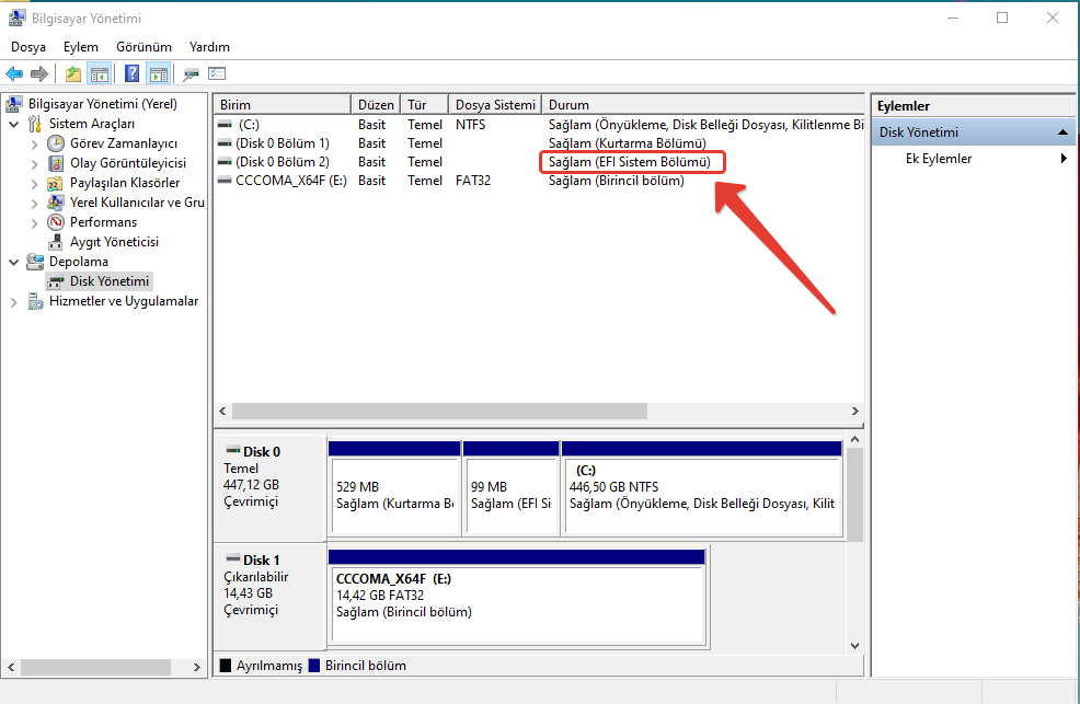4- Bilgisayarım sağ klik Yönet devamında gelen pencereden Disk Yönetimi burada “Birimler” yazan sekmede EFI yazıyorsa bilgisayarınızda UEFI BIOS Modu, EFI yazmıyorsa ESKİ BIOS Modu kullandığınız anlamına gelecektir.