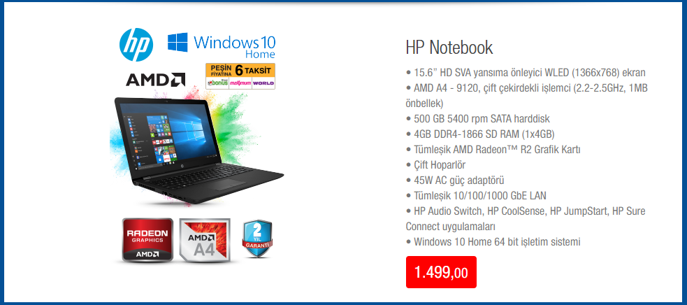 - İşlemci: AMD A4 – 9120 Çift Çekirdekli İşlemci (2.2-2.5GHz, 1MB önbellek)
