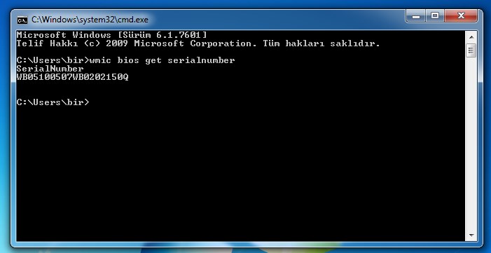 Komut satırı kısmına : wmic bios get serialnumber yazıp bios seri numarasını öğreniyoruz. İşlemimiz bu kadar.