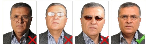 Gözlük kullanılıyorsa gözler net bir şekilde görünmeli, gözlük camı üzerinde yansımalar bulunmamalı, renkli cam veya güneş gözlüğü kullanılmamalıdır. Gözlük camının kenarı veya çerçevesi gözleri kapatmamalı ya da gözleri kapatacak ölçüde kalın olmamalıdır.