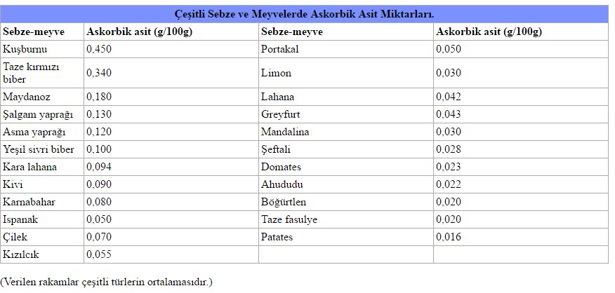Sebzeler, özellikle kuşburnu, karnabahar, lahana, ıspanak, kuru soğan, biber, turp, tere, maydanoz ve yer elması askorbik asit bakımından en zengin kaynaklardandır. Aşağıdaki tabloda çeşitli sebze ve meyvelerin askorbik asit değerleri görülmektedir.