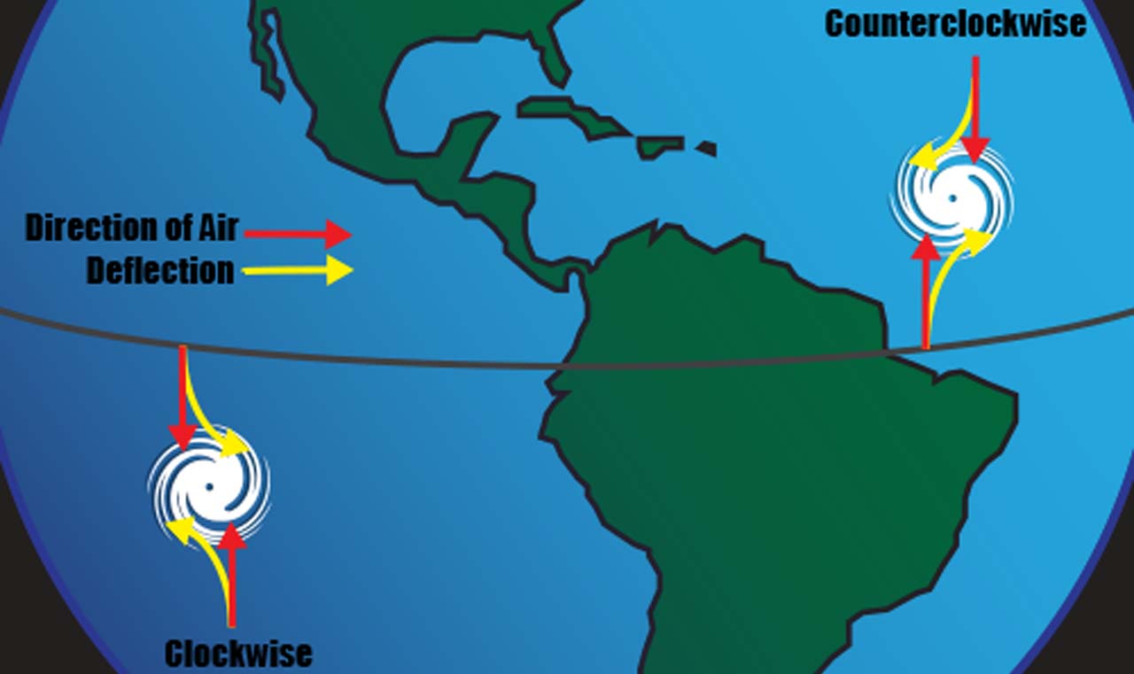 Dönmekte olan bir platformun karşı kısmına ilerlemeye çalışan bir bilye doğrusal olarak hareket edemez ve bu hareketini eğri çizerek yapar. Bu durum Coriolis etkisi nedeniyle oluşmaktadır. Bundan yola çıkarak, dönmekte olan dünyamızın yüzeyinde hareket halinde olan hava, güney yarı kürede hareket yönünün soluna, kuzey yarı kürede de hareket yönünün sağına hareket eder. Daha da açıklamak gerekirse; Dünya doğu istikametine doğru dönme hareketi gerçekleştirirken, yerküredeki hava ve su kuzey yarı kürede saat yönüyle aynı istikamette, güney yarı kürede ise saatin ters istikametinde kıvrılmaktadır. Ortaya çıkan bu etki, tropik kasırga ve rüzgarların uyduile çekilen resimlerinde çok daha rahat görülebilmektedir.