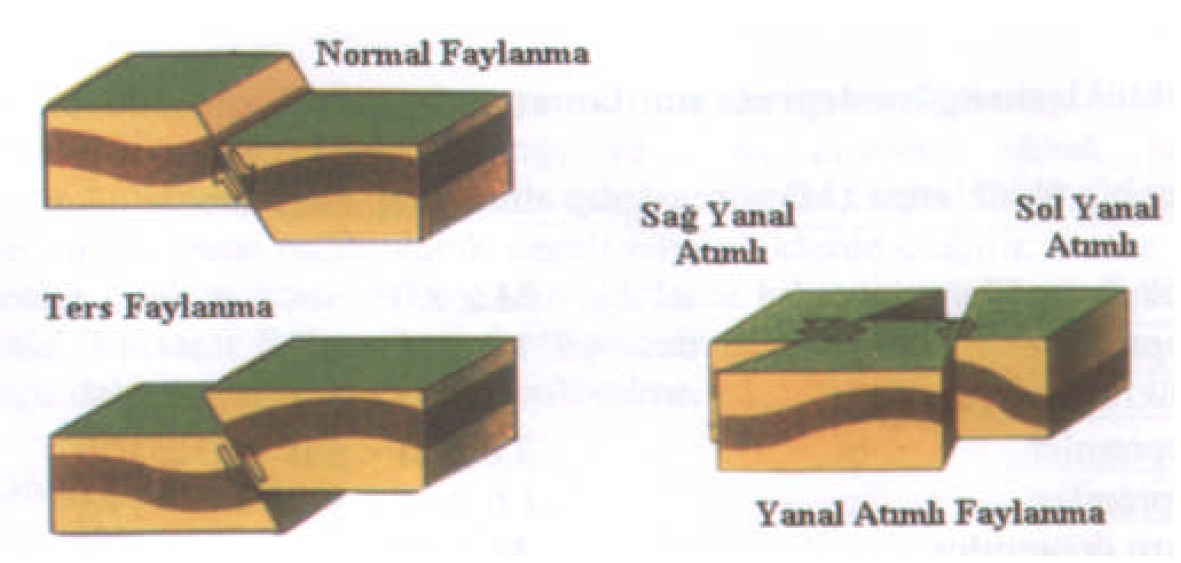 Fay Çeşitleri: Normal faylanma, genelde yer kabuğunda yatay çekme sonucu oluşur. Ters faylanma, yatay basınç kuvveti sonucu oluşur. Yatay sıkıştırmalı faylanma da bloklar birbirlerine nazaran yatay hareket yapar. Yatay faylanma hareketinin sağ veya sol atımlı olduğu ise faya üstten bakılarak anlaşılabilir. Üstten bakıldığında, relatif yer değiştirme sağa doğru ise sağ atımlı, sola doğru ise sol atımlı olarak tanımlanır.