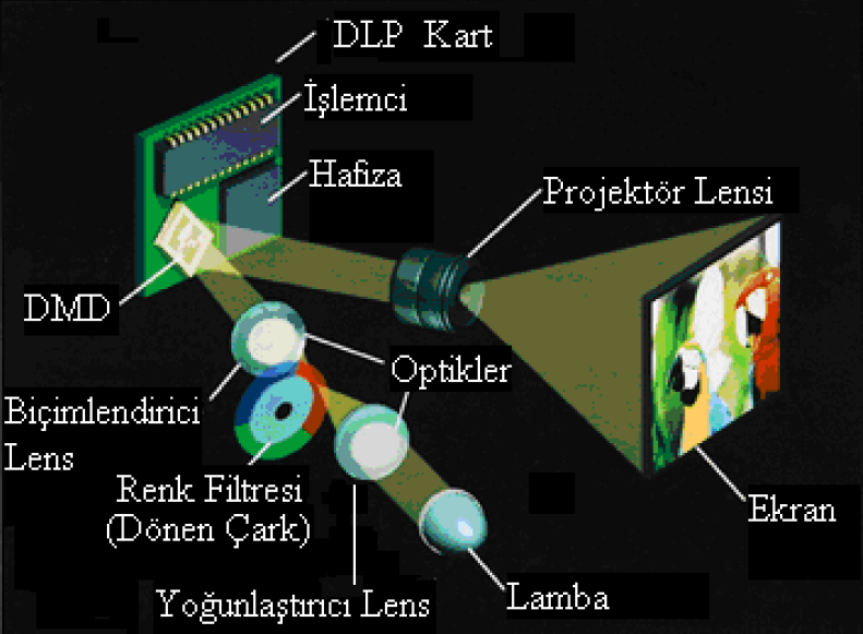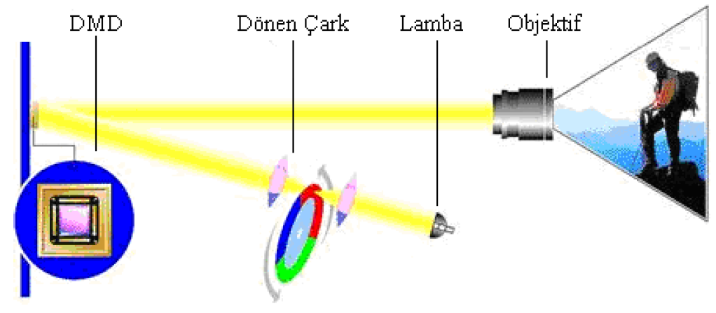 Üstteki şekilde görüldüğü gibi DLP teknolojisi ile üretilen projeksiyon cihazlarında lamba ışığı, yoğunlaştırıcı lense gelir. Daha sonra üzerinde kırmızı, yeşil ve mavi renk bulunan dönen bir çark içinden geçerek DMD chip’te (Digital Micromirror Device – Dijiltal mikro ayna cihazı) oluşan renkli görüntü objektiften perdeye yansır. DMD chip’te 500.000’den fazla çok küçük ve ince mikro aynalar bulunmaktadır. DMD chip’in tamamı bir insan tırnağı kadardır. DMD chip ile üretilmiş projeksiyon cihazları, DMD üretiminin riskli ve pahalı olması nedeniyle LCD teknolojiyle üretilmiş projeksiyon cihazlarına oranla daha pahalıdır.