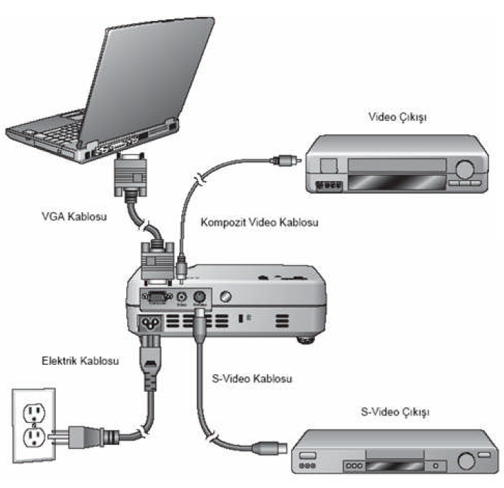 Projeksiyon cihazına bilgisayar, video, DVD, fotoğraf makinesi, kamera, uydu receiver, ses sistemi vb. cihazlar bağlanabilir. Bu cihazlardaki istenen görüntüler perdeye büyütülmüş olarak yansıtılır. İlgili cihazlar kullanılırken bu cihazlara ait kablo ve yardımcı malzemelerin mutlaka bulundurulması gerekir. Bağlantılar yapılırken dikkat edilmeli ve bağlantı sonrasında projeksiyon cihazının ilgili kaynağı algılaması sağlanmalıdır. Algılama işlemi çoğunlukla otomatik olur ama bazen ilgili cihazın kullanım kılavuzundan yararlanmak gerekir. Günümüzde projeksiyon cihazları, bilgi kaynağı olarak sıklıkla bilgisayarları kullanmaktadır. Cihazın masaüstü bilgisayarını algılaması otomatik olarak gerçekleşirken dizüstü bilgisayar bağlantılarında klavyeden Fn + F8 tuşlarına basarak projeksiyon cihazının bilgisayarı görmesi sağlanmalıdır.