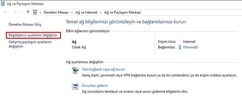 2- Açılan pencerede bağdaştırıcı ayarlarını değiştiri seçin.