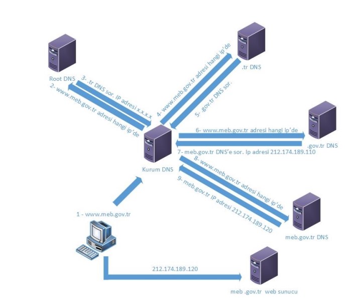 İnternet üzerinde DNS’nin nasıl çalıştığına şekildeki gibi bir örnek verebiliriz. Bilgisayarımızda web yarayıcısına www.meb.gov.tr yazdığımız zaman neler olduğuna bir bakalım. Özetlersek isim çözümleme işlemi aşağıdaki şekilde gerçekleşir.