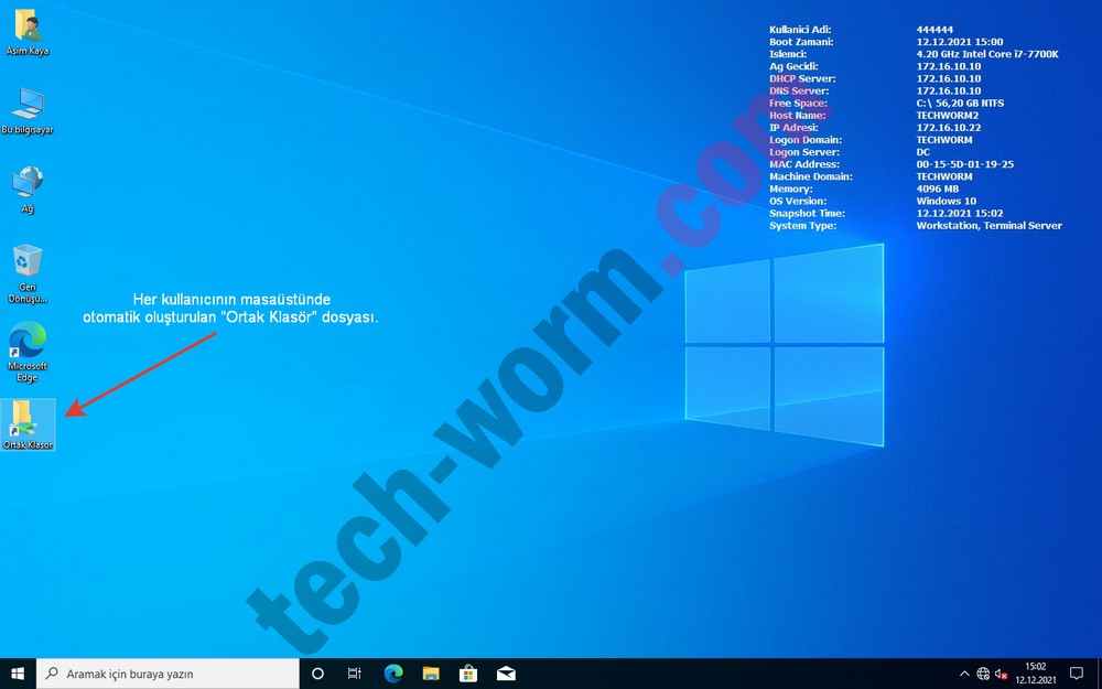 10- İşlemimiz tamamdır. DC’den gpupdate /force komutunu uyguladıktan sonra bir bilgisayara geçip masaüstünü kontrol edelim. Bu aşamadan sonra bilgisayarında oturum açan kullanıcılar masaüstlerinde “Ortak Klasör” simgesi göreceklerdir. (Bilgisayarınızı yeniden başlatmayı unutmayın.)