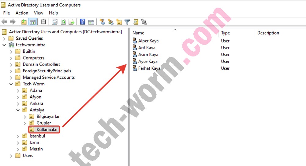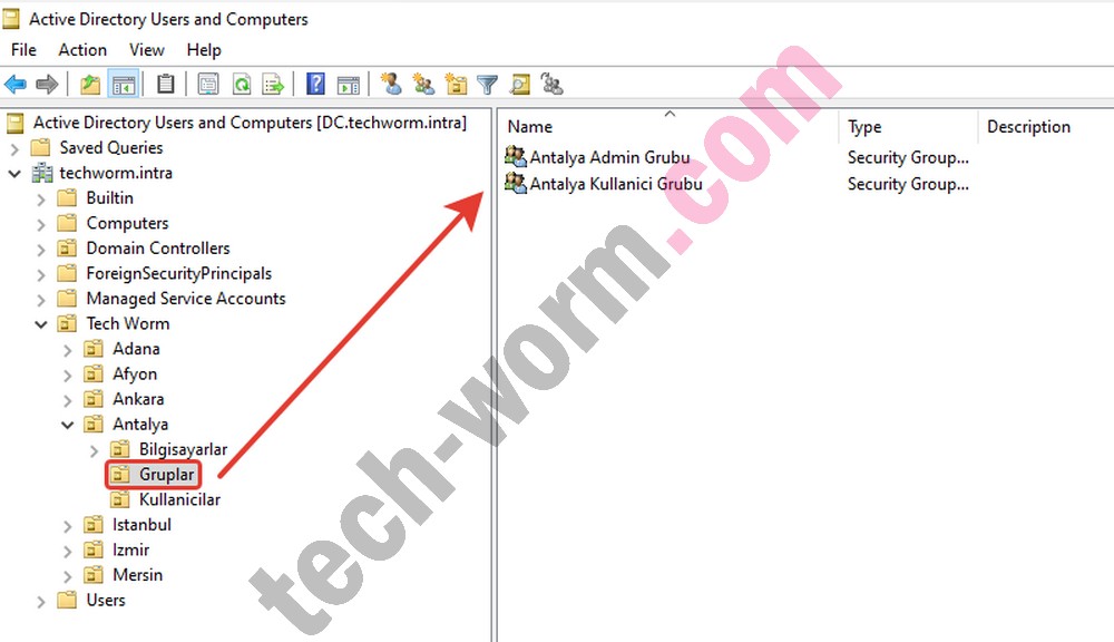 3- Ardından aynı şekilde Active Directory dizininde admin ve kullanıcılar adında iki grup oluşturuyoruz.
