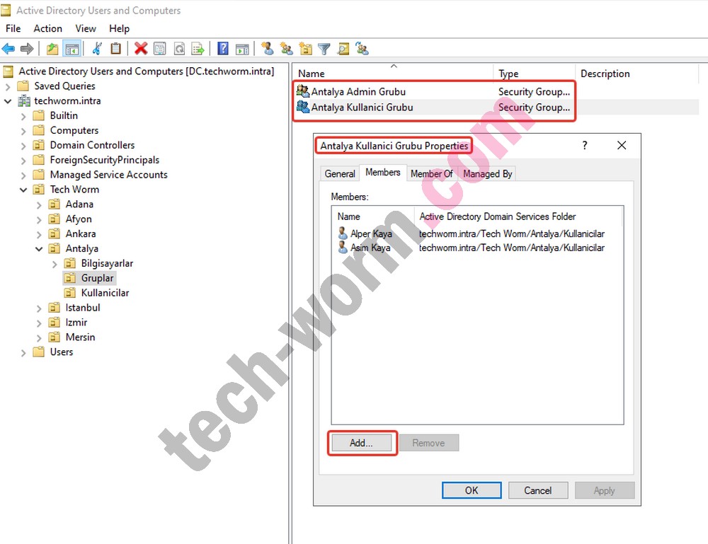 4- Oluşturduğumuz gruplara kullanıcılarımızı ekliyoruz. Ayrıca “ortak klasör” içeriğinde tam yetki için seçtiğimiz kişi veya kişileri admin grubuna ekliyoruz.
