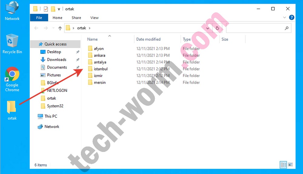 Ekranda şu anda İstanbul’daki bir bilgisayarda oturum açmış kullanıcı masaüstü görünüyor. Bu kullanıcının masaüstünde, sadece İstanbul’daki bilgisayarlarda oturum açma yetkisine sahip kullanıcıların erişebileceği “Ortak Klasör” bulunuyor.
